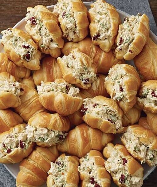 These bite-sized croissants feature tender chicken salad tucked into soft, buttery layers. Each mouthful delivers creamy richness with a hint of crunch and fresh flavor, making them both comforting and elegant.