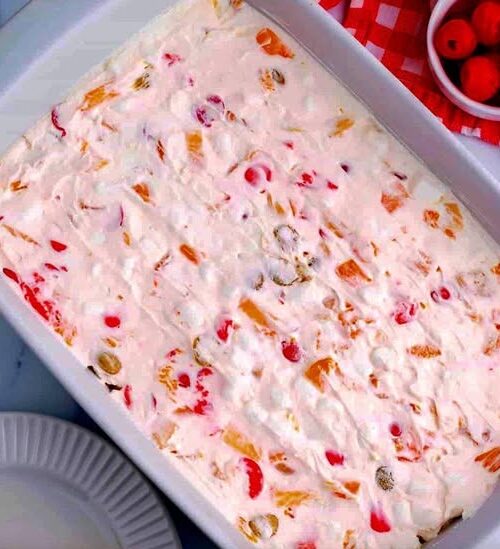 This dessert became popular in mid-20th-century American home cooking, especially in the South and Midwest. It evolved from classic fruit salads and icebox desserts, using freezer-friendly ingredients like whipped topping and canned fruit for convenience.