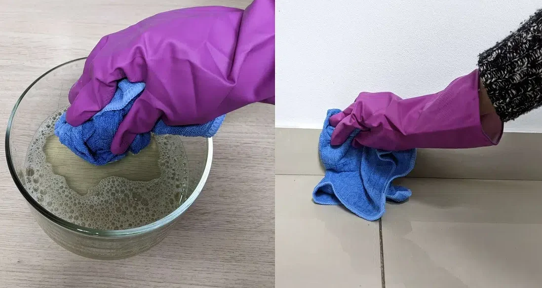 Dip a microfiber cloth or sponge into the soapy water, wring it out, and wipe the baseboards thoroughly.