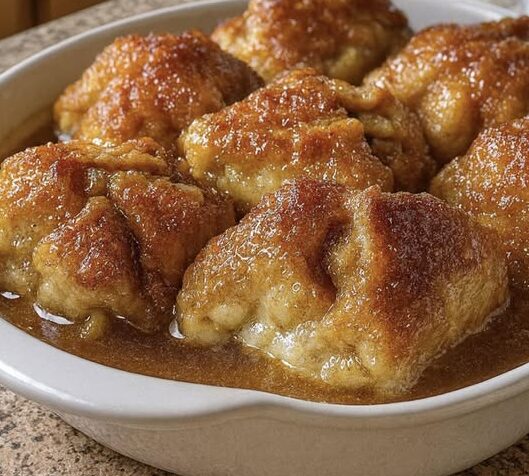 The finished dumplings are golden and tender, with soft apples inside a flaky crust. A sweet, citrus-caramel sauce forms at the bottom of the dish, coating each dumpling. The flavor is warm, rich, and comforting, making it perfect when served warm.
